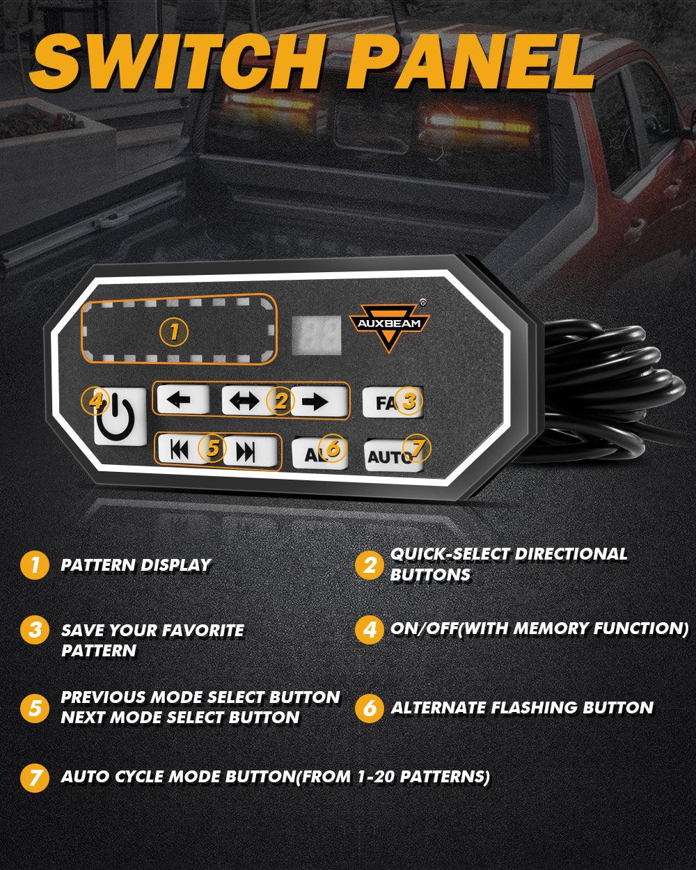 Convenient Control Box: Handy power switch to turn on and off with a digital pattern display screen. 20 different warnings flashing patterns to choose from. Includes an 16.4FT straight cable control switch panel with a 12V cigarette adapter(16.4Ft)