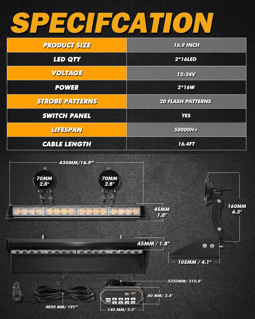 Super Visibility: This 17 inch strobe light bar has 32 super bright high intensity LED. TIR optic lenses offer a super bright light output. It is even visible during daytime conditions, Brighter and more effective than standard LED strobe lights.