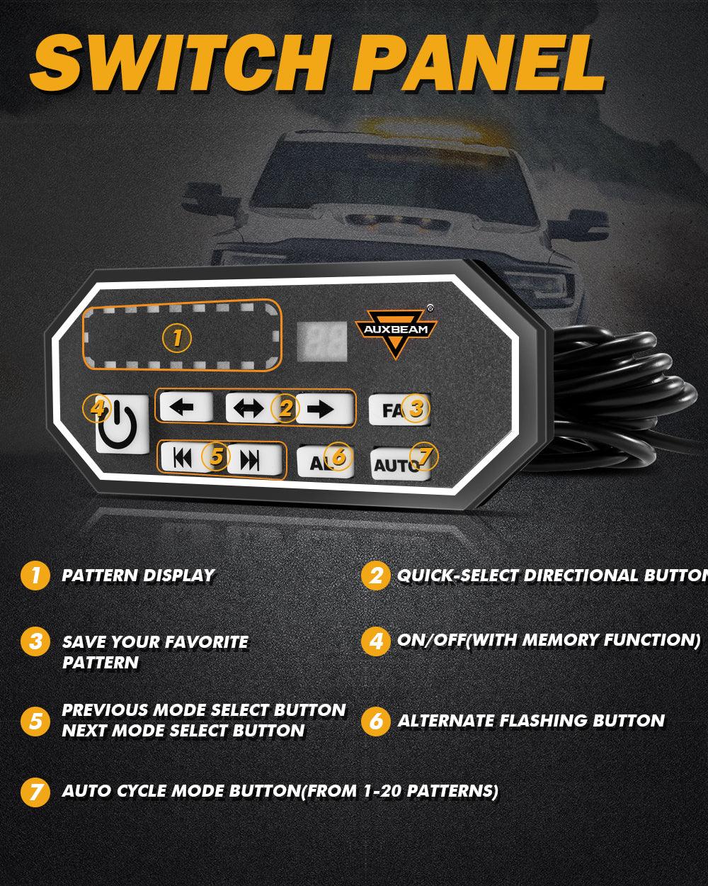 Traffic Advisor Function: Provides caution to potential upcoming hazards.Easy to switch between 20 different strobe flashing modes for quick respondent ever times.These light modes will be controlled by the switch Panel A(It has left,right and both flashing functions,flash alternately and favorite (choose to your favorite mode, hold down FA for three seconds,and you will remember this mode,Every time you press this button, you will jump straight to this feature), and there will be a corresponding light mode display and mode number display on the switch panel A.