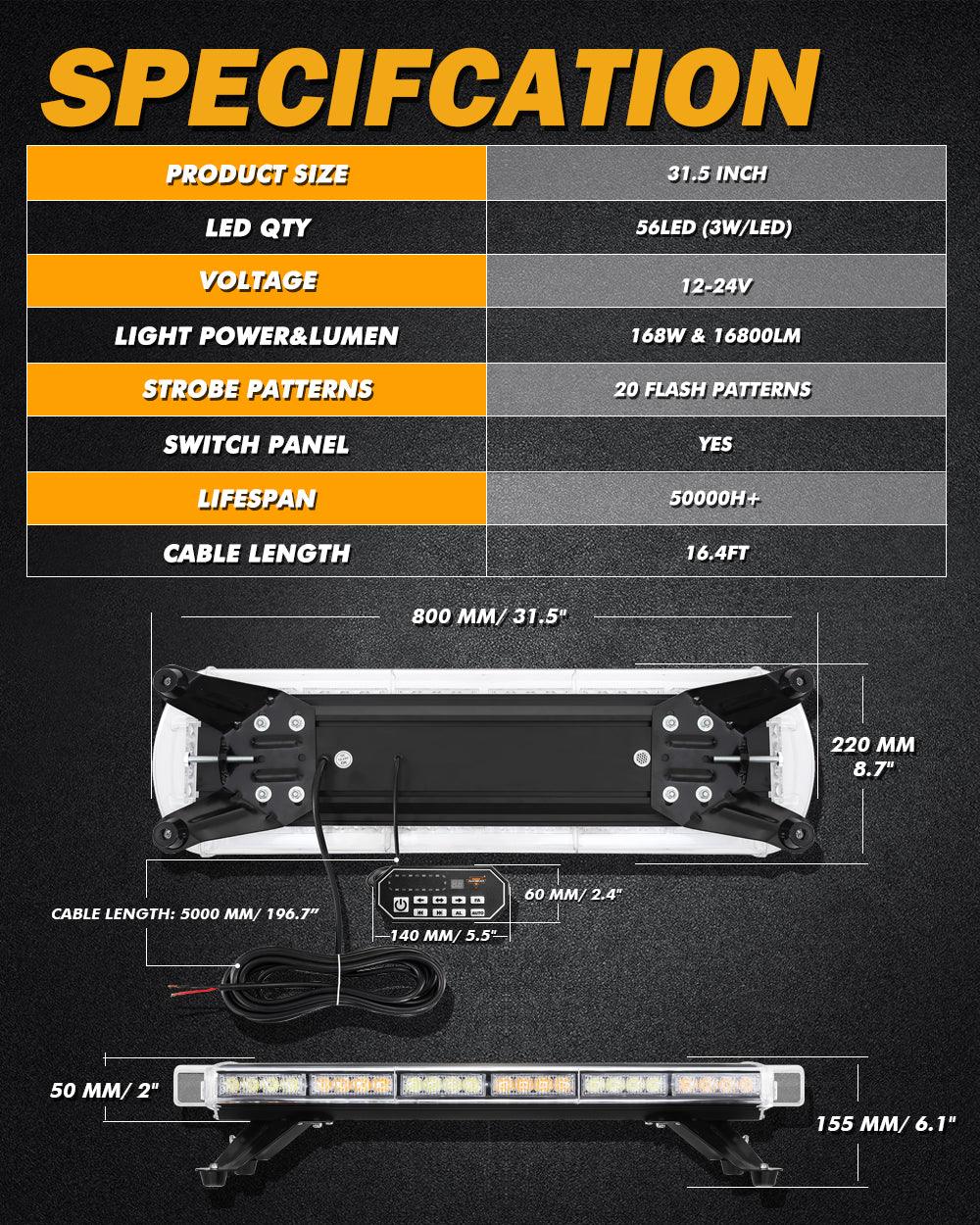 Perfect Bright: This emergency flashing light bar has a total of 56 high-power 3W LED chips. Crystal clear lens for max brightness, visible day and night. Great for law enforcement cars, plow trucks, construction vehicles, tractors, security, snowplow, postal, mail carrier, and city service workers, to warn of potential hazards.