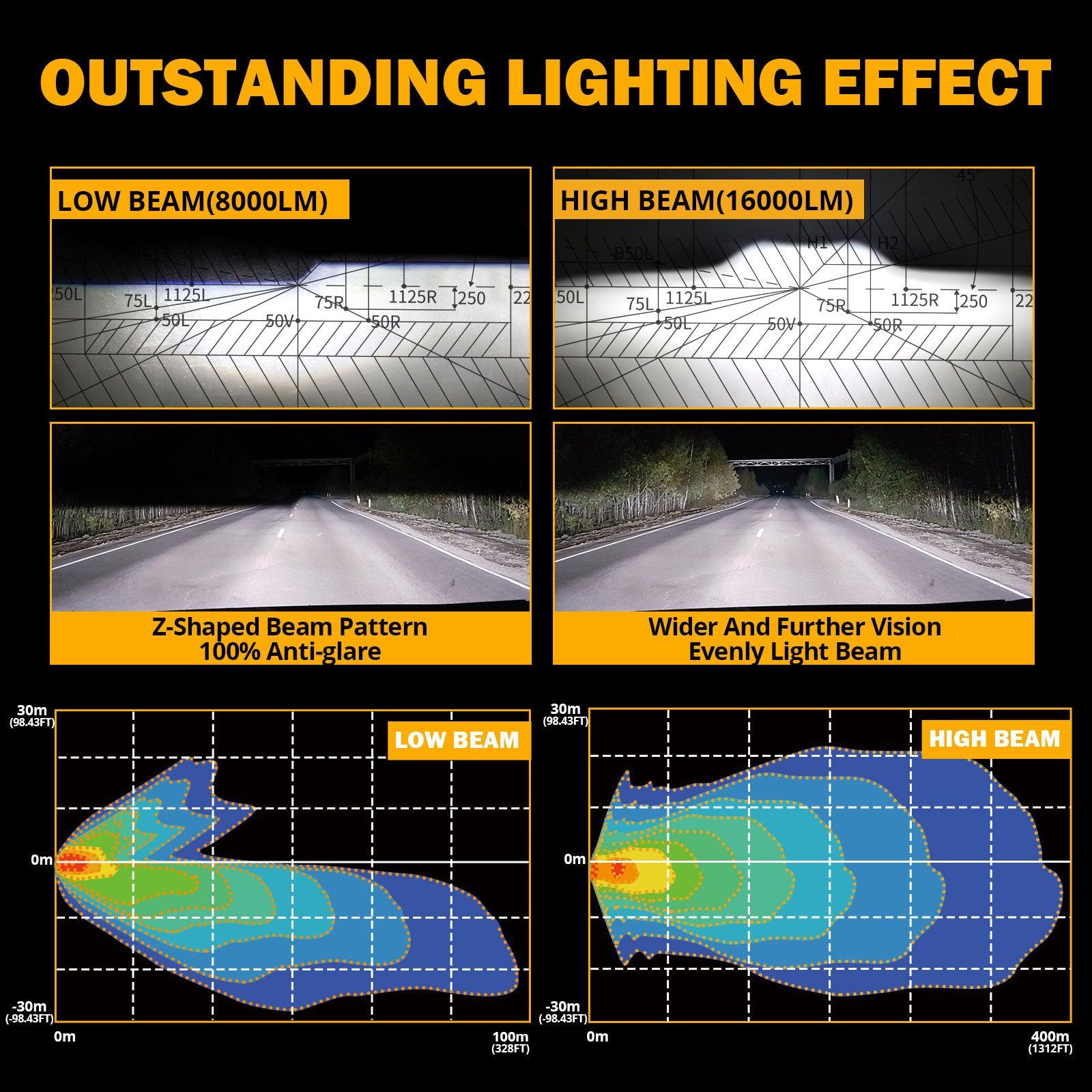Perfect Z-Shaped Beam Pattern: Anti-Glare - Headlights feature ideal Z-shaped cutoff lines to provide brighter, further, more uniform lighting, No Blind Area or dim spots, prevent blinding oncoming drivers, which ensure the safety of you and others. With 4 Lighting Modes: High Beam( 16000lm/pair), Low Beam(8000lm/pair), DRL(white), Turn Signal Light(amber),DOT SAE Approved.