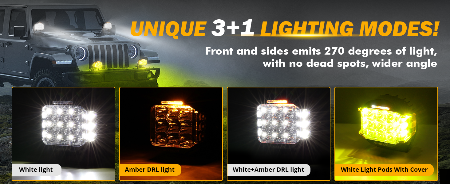 3 Light Modes: Side shooter light and front spot light together are main lighting mode to provide a clearer, wider and further visibility for your night time driving. While amber DRL is a daytime lighting mode to add extra safety by capturing other drivers' notices of your presence on the road. Both modes can be used simultaneously.Combining three modes, it’s the perfect light to ensure your safety throughout the whole day.