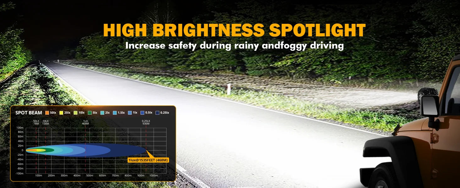 TRUSTED DRIVING VISION: Multi-function led pod lights feature two types of LEDs: P8 and 3030 SMD chips. With a powerful 112W output, they deliver 12,800 lumens and a lighting distance of 1lux@468M (1535 feet). The spotlights provide high efficiency and focused illumination over long distances, making them perfect for high-speed driving or off-road adventures where you need to see far ahead on the trail or road.